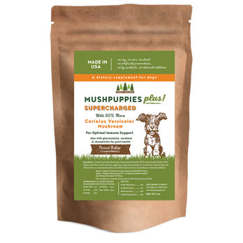 New, supercharged immune support for your pet. MushPuppies Plus is packed with 50% MORE Coriolus Versicolor than our standard MushPuppies. MushPuppies are made with the immune supporting Coriolus Versicolor mushroom. Includes Glucosamine, Carotene and Chondroitin to assist with bones and joints. The Coriolus Versicolor Mushroom is an all-natural botanical found to help support the body’s own immune system. It is widely known that the immune system is the body’s first defense against the smallest of ailments to the most complicated. There are hundreds of studies worldwide conducted on Coriolus Versicolor on its immune supporting and properties including such notable institutions as Sloan Kettering Center of New York, MD Anderson Center of Texas, and one completed by the University of Pennsylvania School of Veterinary Medicine. We have been providing our proprietary blend of Coriolus Versicolor for over ten years for both humans and pets. Our process ensures a highly potent strain of Coriolus Versicolor, harvested at the mycelia stage (not the fruited body), and ensures the highest quality of polysaccharide peptide (PSP) and polysaccharide krestin (PSK).